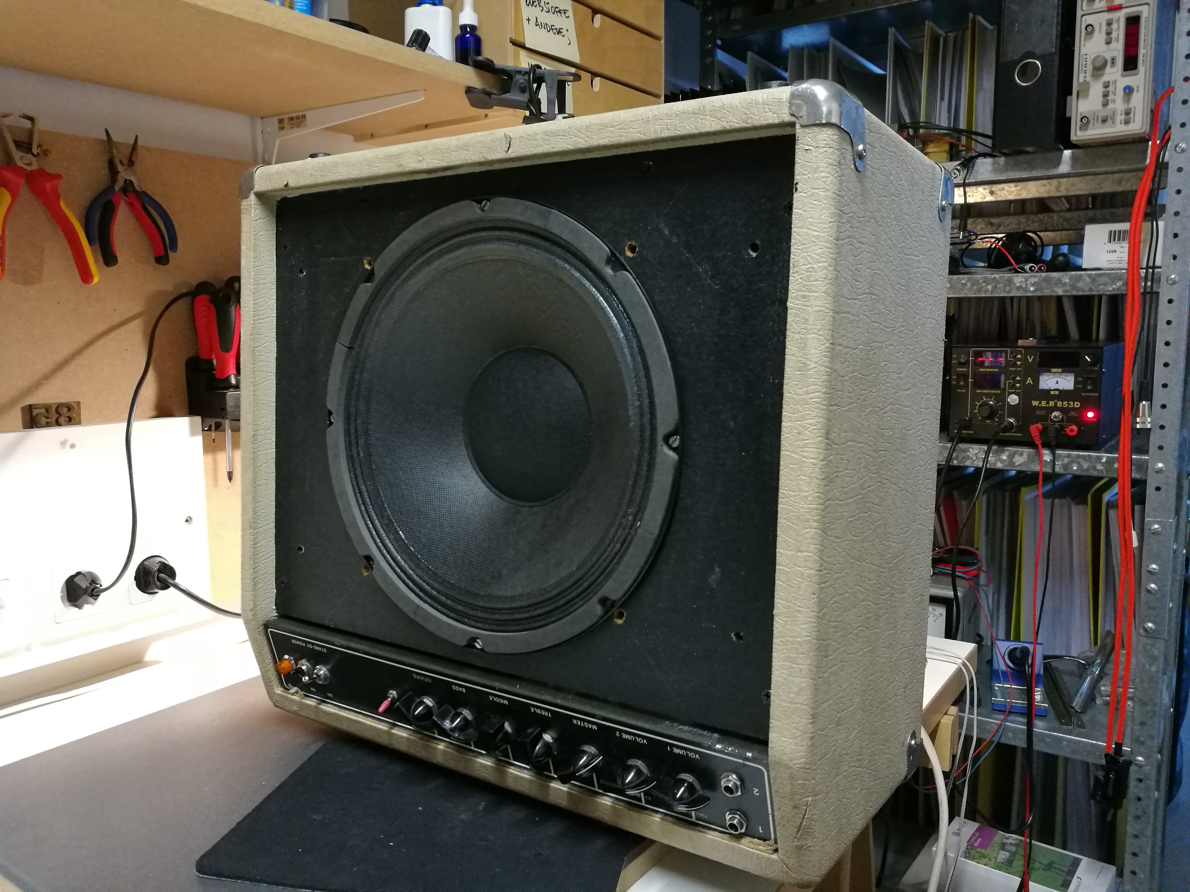 Fender Twin Reverb, irgendwo aus den frühen 70ern und irgendwie sexy abgerockt. Wunsch war, das Ding nicht kaputt zu restaurieren, die Spuren der Zeit zu erhalten. Außen also a little bit Pfui und innen dann a lot of Hui. Das Ergebnis überzeugt, die Bühne wartet.